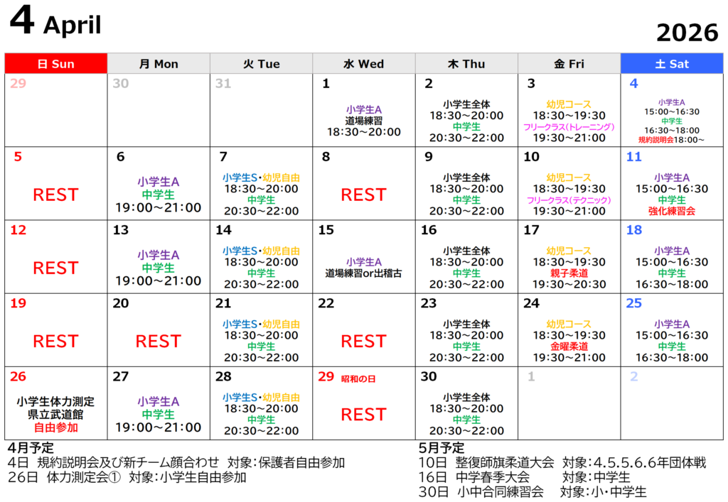 第1週:トレーニング/第2週:テクニック/第3週:親子柔道教室/第4週:オープンマット(金曜柔道)